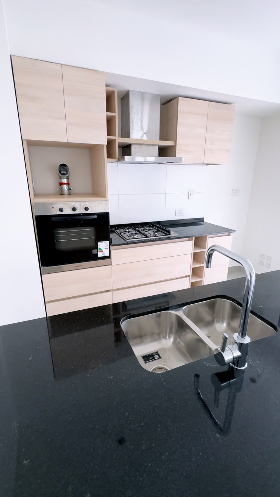 Enorme Living comedor, con isla, horno empotrado, anafe, purificador de aire y amoblamientos de 1era- calidad. Grandes balcones de 7 y 9 mts de largo.